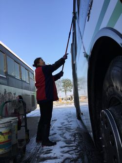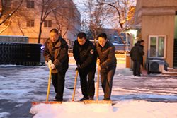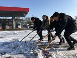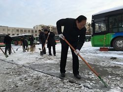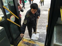 5點,分公司、路隊兩級管理人員全部按照分工,到達指定線路、樞紐站,開始協(xié)助司機加水、熱車,做好發(fā)車前的準(zhǔn)備。6點半,總公司、分公司機關(guān)管理人員開始清掃站點積雪;客流集中的各大站點,管理人員已經(jīng)在疏導(dǎo)乘客,指揮車輛進出站。初冬的凌晨溫度最低,冷風(fēng)直透心底。上午9點多,當(dāng)直播五十分和唐山交通臺的記者趕到遠洋城站點采訪時,一公司的管理人員已在此堅守了四個多小時。大雪讓車身結(jié)了厚厚的一層冰和泥,保潔員們用工具一點一點艱難地清理著。