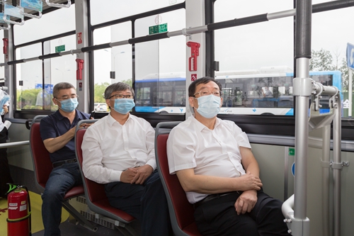 隨后,一行人登上公交車,總經(jīng)理劉東占對新能源公交車的上線運營情況,充電站建設情況,新車電池續(xù)航里程、安全性等方面做了介紹。