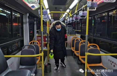 凌晨5:20,等待發(fā)車的我迎來(lái)幾張陌生面孔,莫不是新入職的駕駛員?原來(lái)他們暫時(shí)不能承擔(dān)駕駛員的工作,但是他們加入了防控的隊(duì)伍。為準(zhǔn)備上崗的駕駛員測(cè)量體溫,給運(yùn)營(yíng)車輛在出車前、收車后集中消殺通風(fēng),針對(duì)乘客易接觸的投幣箱、扶手、座椅等部位重點(diǎn)消毒,嚴(yán)格執(zhí)行一趟一通風(fēng)、一趟一消殺。老搭檔告訴我,只有接受消毒噴灑的洗禮,才能躋身抗擊疫情的行列。“來(lái)吧,我身經(jīng)百戰(zhàn),怎會(huì)退縮!”一切準(zhǔn)備完畢,出發(fā)。