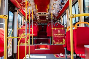 整條線路以黨史和黨的路線方針政策為主題,在車廂內(nèi)進行了多種方式的宣傳:車內(nèi)方便乘客站立時使用的小小拉環(huán),一面是“唐山黨史”公眾平臺二維碼,乘客可用手機掃碼,利用乘坐公交車的間隙學(xué)習(xí)黨史,另一面是黨的歷史大事件、十九大精神等內(nèi)容;主題車廂以紅色背景為主基調(diào),對中國共產(chǎn)黨百年歷程的重大決策、重要會議、重大歷史事件,設(shè)計制作了圖文并茂的宣傳畫,在車廂內(nèi)進行展示。