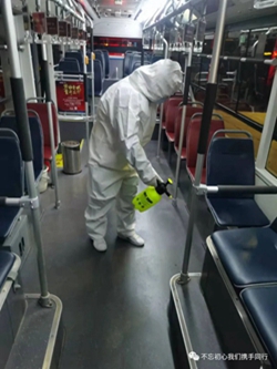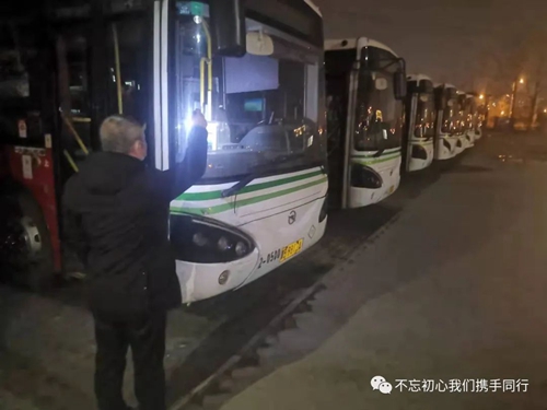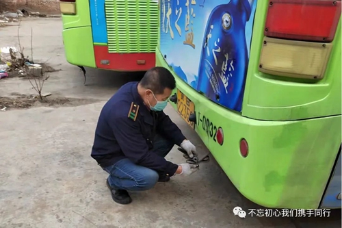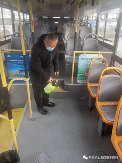 3月22日一大早,伴隨著“轟轟”的發(fā)動(dòng)機(jī)聲,118路司機(jī)竇玉海將韓城李莊子車場內(nèi)停駛的30部公交車一一“喚醒”。“車輛長期停駛,電瓶容易虧電,會(huì)導(dǎo)致車輛打不著火,所以隔幾天就要啟動(dòng)一次。”啟動(dòng)完車輛后,竇玉海又馬不停蹄地對(duì)車輛技術(shù)狀況、車載安全設(shè)施正常使用情況進(jìn)行了認(rèn)認(rèn)真真的逐車檢查。一通忙碌下來將近三個(gè)小時(shí),此時(shí)他又踱步在場區(qū)的角角落落開始了消殺工作。