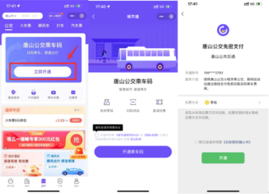 第一種:打開微信,搜索“城市通”小程序,定位到唐山市或者搜索城市列表中的唐山市,選“公交”或“出行”頁(yè)面,確認(rèn)開通乘車碼和免密支付后就可以刷碼出行啦,無(wú)需每次輸入支付密碼,方便快捷。